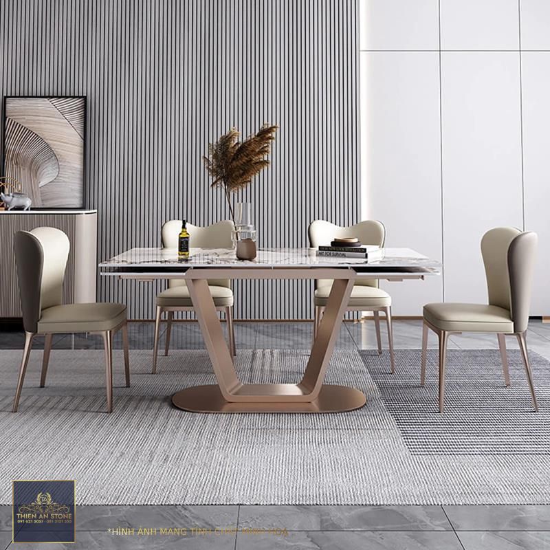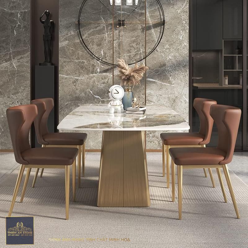 Bộ bàn ăn này có mặt bàn làm từ đá tự nhiên cao cấp, kết hợp với chân bàn bằng kim loại tạo nên sự sang trọng và hiện đại cho không gian phòng ăn. Kích thước 180×90 cm phù hợp cho gia đình 6 người.