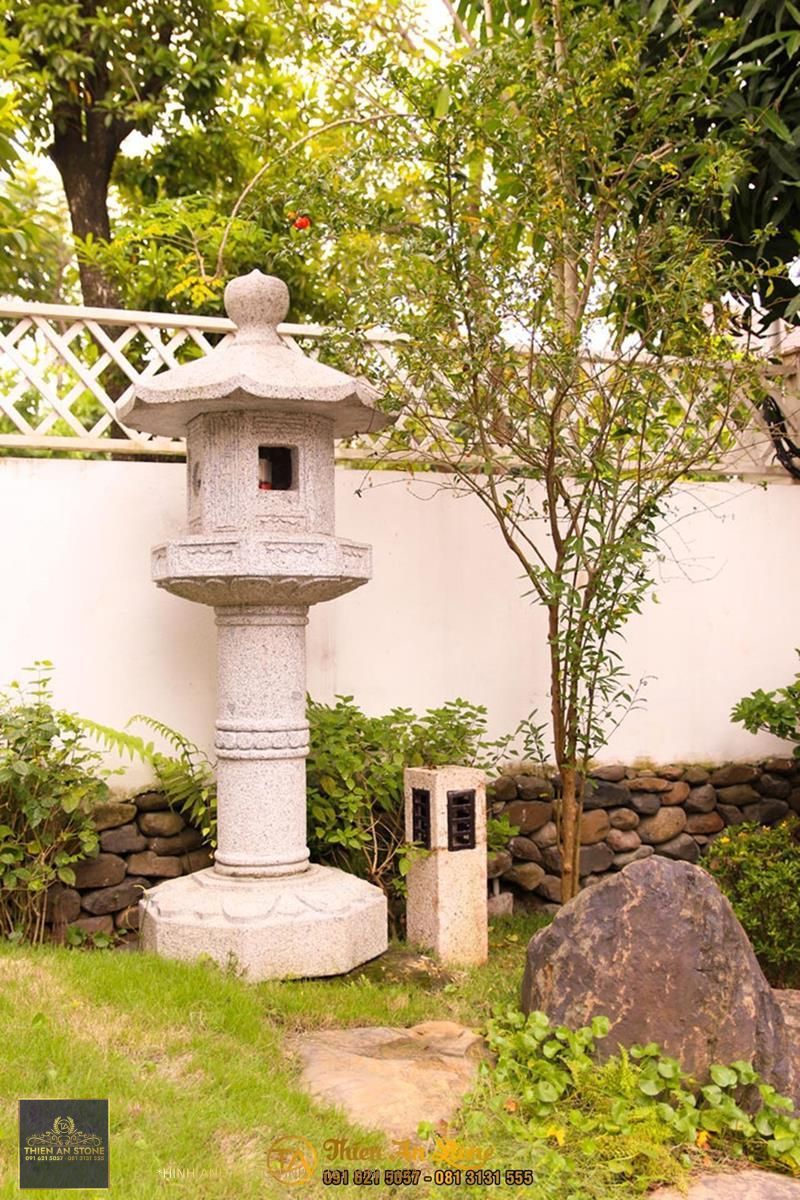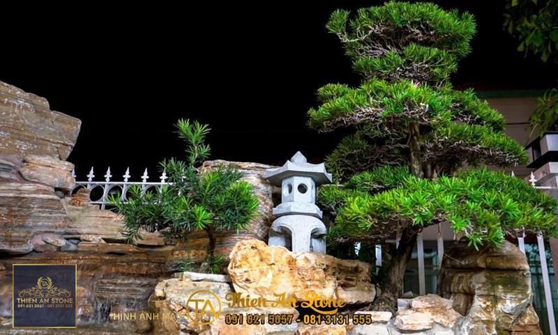 Tiểu cảnh với cây xanh và đèn nước